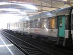 Refurbished 2nd-class Corail compartment-car (B11u) of SNCF-GL ("Nouvelle Décoration"), seen in Paris-Est, in the consist of a Paris-Charleville Mézières service.
