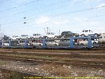 French MOFOLS freight type Laaers (NVR 23 87 4363 674-4 RIV F-MOS) with also DB logo, loaded with new cars in composition to a train that stops on track 4 at San Giorgio di Piano BO Station. 16/05/2024