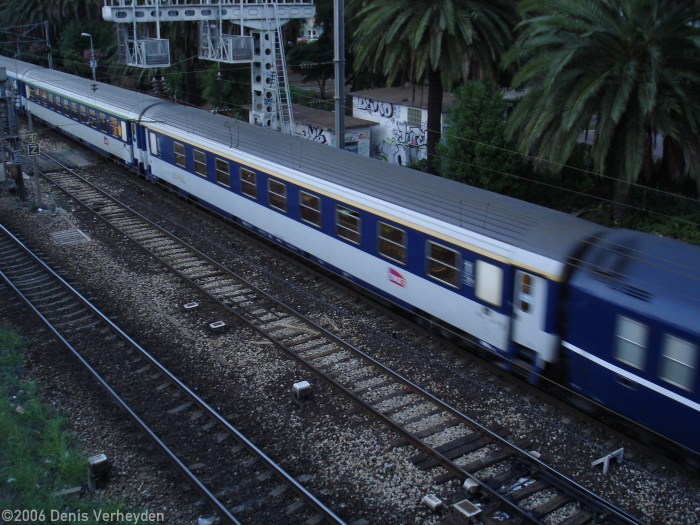 A SNCF Corail night A9c9ux carriage was seen in the consist of TRN 5770 (Ventimiglia - Paris Austerlitz). Antibes , 27/07/2006. Photo by : Denis Verheyden |