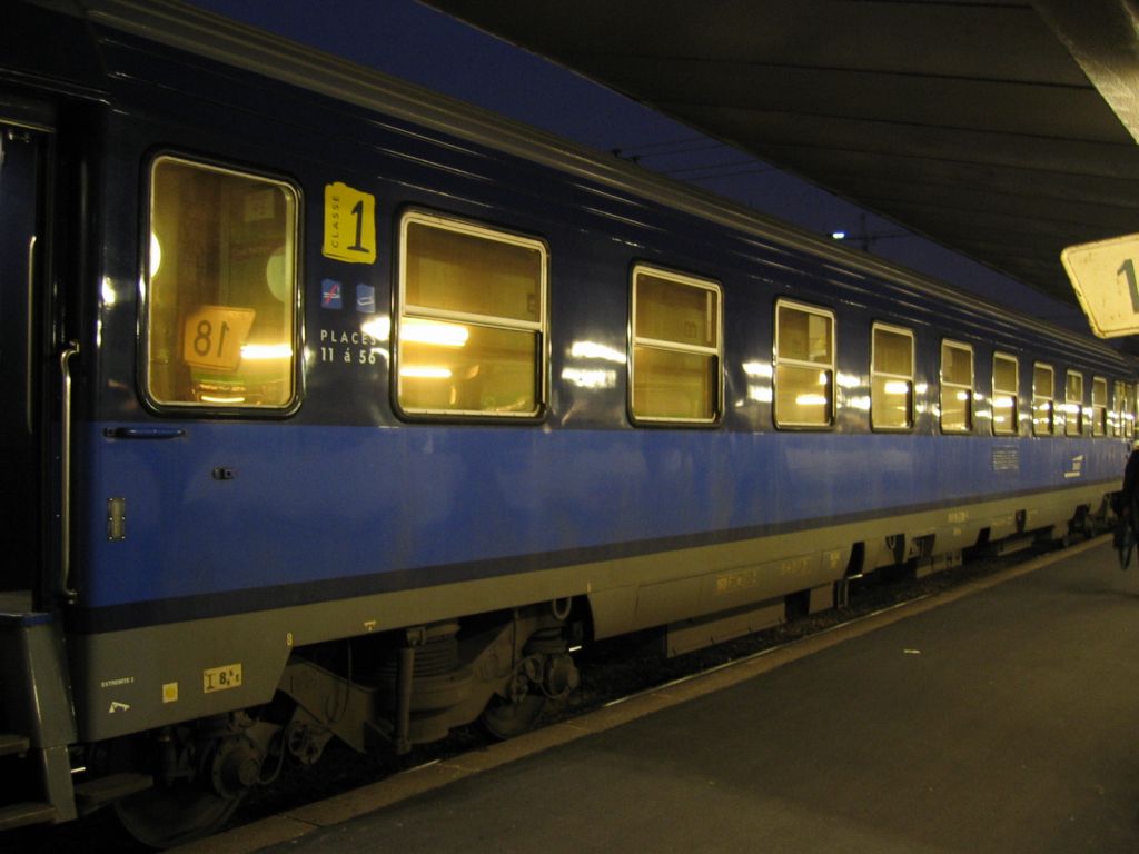 Voiture couchette 1ère classe du Corail Lunéa "La palombe bleue" en gare de Lourdes, janvier 2007