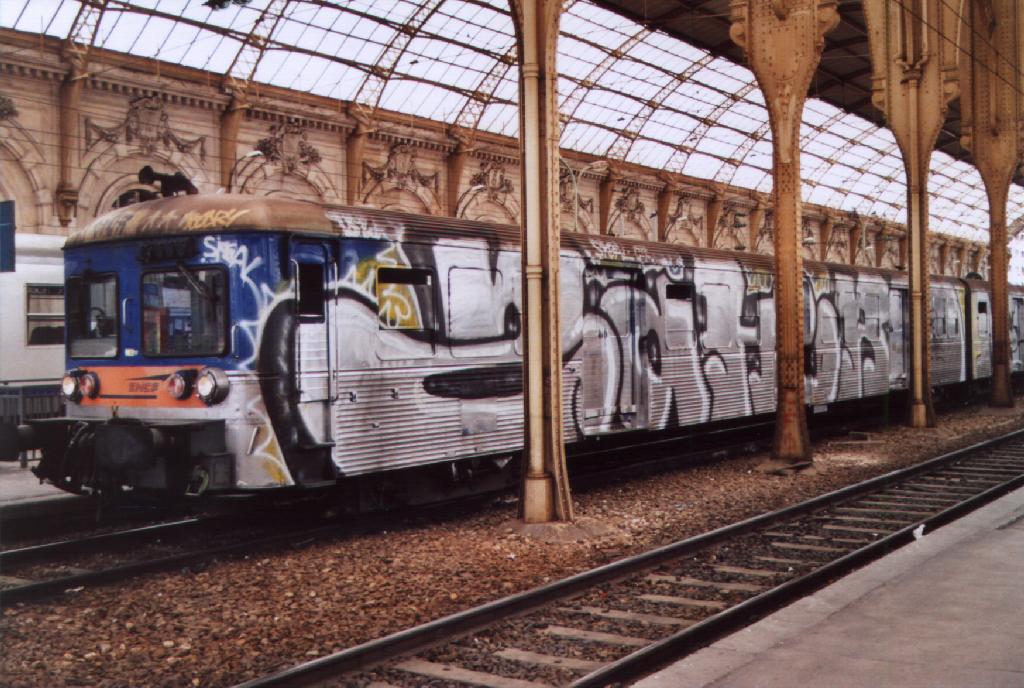5 cars of a 6-car RIO trainset fully covered by a big continuous graffiti, seen at Nice in June 2006. Excuse me! Which car is the 1st class car? ***** 5 des 6 voitures d'une rame RIO couverts d'un gros graffiti continu, en gare de Nice en juin 2006. Excusez-moi! Quelle voiture est la premiere classe?