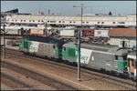 France BB 67400 67477-67480 are leaving the station of La Rochelle heading Bordeaux. Both engines present some differences in their color scheme. 12.15pm July 18th 2003 Photo Patrick Meunier Pmeunier23@aol.com |