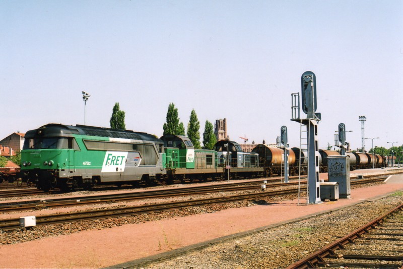 SNCF - France Diesel locomotive (4)67597 of SNCF class 67400 in Fret colours with a passenger train in Lille Flandres station. Lille, 03/07/2002