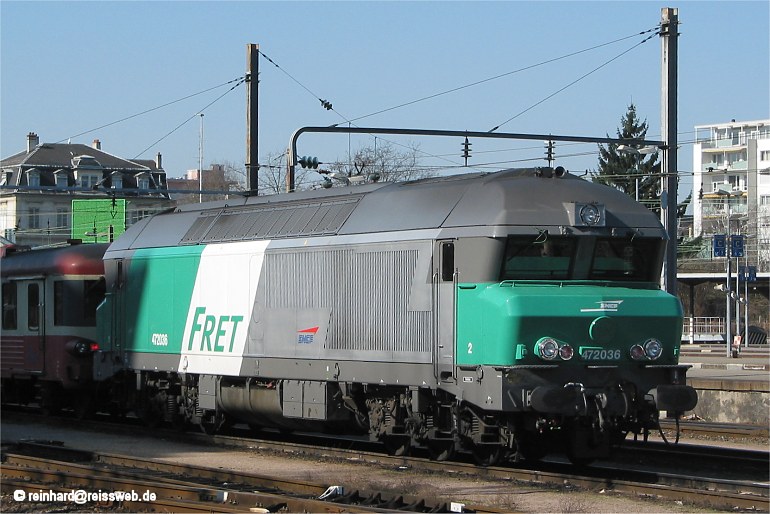 SNCF CC 72036 in the new "FRET"-livery, stabled in Mulhouse. Loco number is 472036, the "4" expresses a loco from the freight division of SNCF (14.03.2003)