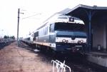 SNCF - France Diesel locomotive (1)72061 has just brought a TGV-Atlantique set from Nantes to Les Sables-d'Olonne. This line is not yet electrified but Les Sables is a famous resort. With this solution direct trains from Paris are possible. Les Sables-d'Olonne, 06/07/2002