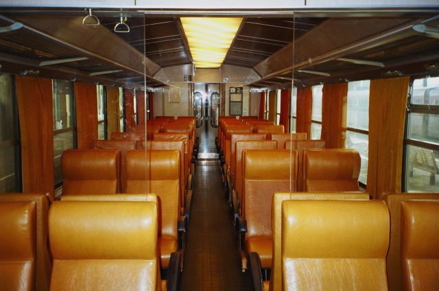 Interiors of a Second-class car (TRBu) of a RTG Jet Train of SNCF, seen at Lyon-Perrache, awaiting departure to Bordeaux-St Jean on Train 4580. Airline-style seats, with good legroom, identical to that available in First-class. Seats are an improved version of that of B10t USI cars. Whereas they were reclinable until the late-80s, they have been fixed since then. The banana plastic leather is doubtless old-fashioned. Yet, interiors are still well-kept. 31st December 2003 P.L.Guillemin (plguillemin@yahoo.fr). |