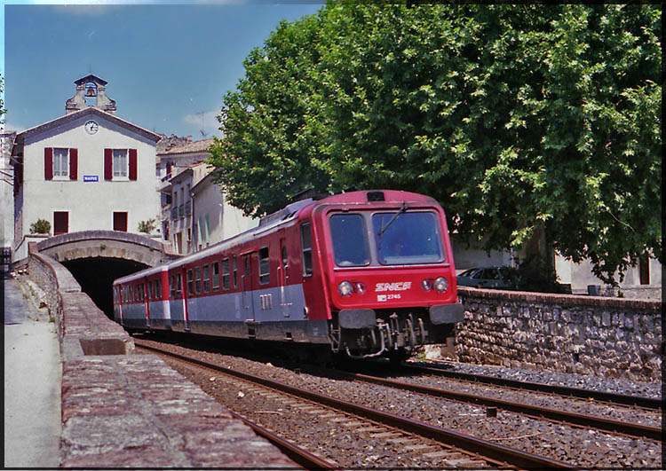 | SNCF- Dmu X2745 DMU is passing through Nozières Brignon, on the way from Alès to Nîmes. It looks like emerging out of the basement of the town hall, in the background! 1997 July PhotoPatrick Meunier, Website: PixyRail-Trains de Poissy |