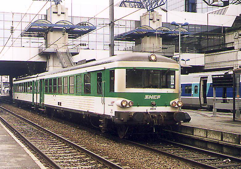 SNCF DMU Class X 4500 X 4624 was "light" modernised for local trains in Bretagne. It has new seats, and this new green livery. Picture taken at the station Rennes, on April 26th, 1998. Photo and scan by Benoit Gehant - bgehant@ese-metz.fr |