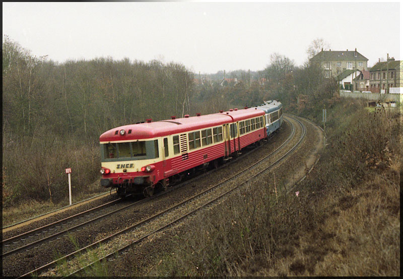 | SNCF-X 4750 + 4900 are leaving Elbeuf St Aubin, bound for Rouen - 1987 PhotoPatrick Meunier, Website: PixyRail-Trains de Poissy |