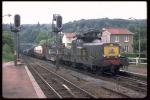 SNCF BB 12037 / AC electric / in POISSY 27KM W of Paris on Normandy line. It is joining Track 1 , after a long stop into the station due to overtaking. This potash train covered daily a long way from Alsace to Le Havre. Such engines , belonging to the northern shed of Lens, appeared very few on the Normandy line . They do not appear any more in 1999. April 1989 Photo and scan, Patrick MEUNIER Pmeunier23@AOL.COM |