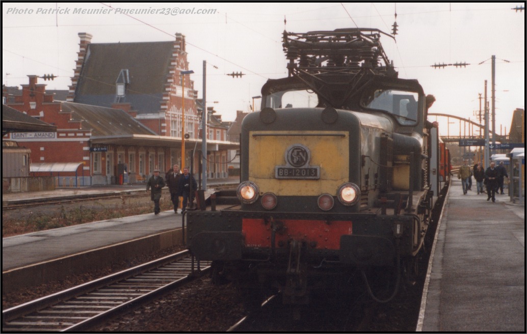 SNCF AC electric BB 12013 is halting in the station in the station of St Amand les Eaux. IFC trip around Lille, in memoriam BB12000 - 1999 Décembre 4th