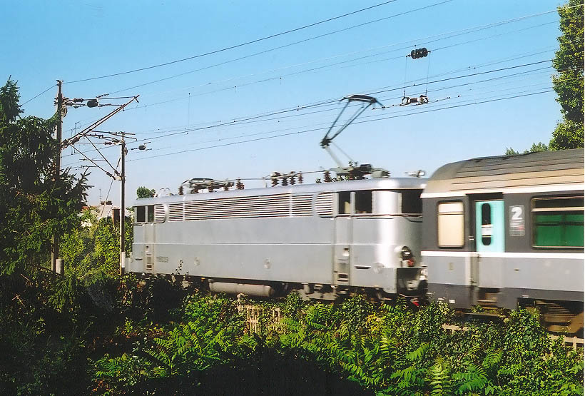 SNCF BB 16012, in the early morning, is passing Poissy. September 2004