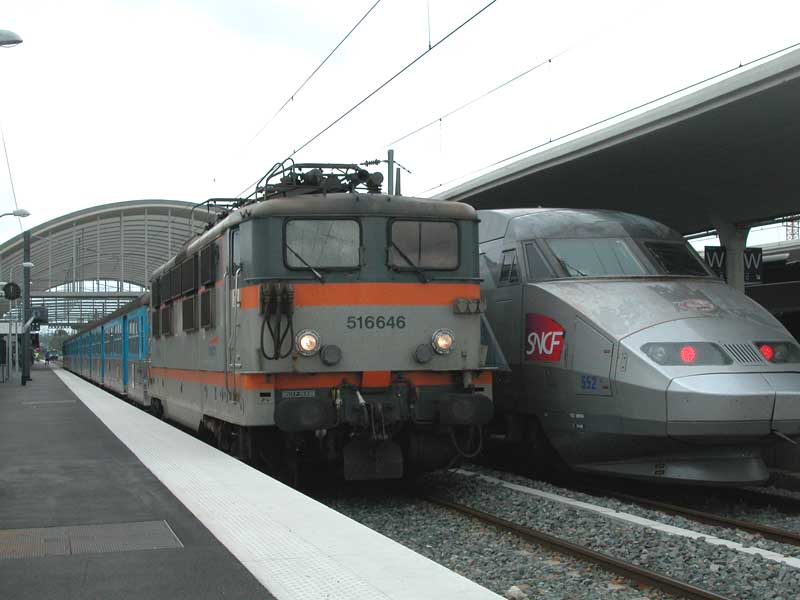 SNCF - France Slow and fast: while electric locomotive 16616 is ready to depart with a local service to Douai, a TGV departs towards Paris. Valenciennes, 6 August 2005 Digital photo by Marco van Uden |