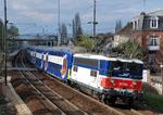 A double deck train, composed with a VB2N Transilien set and the BB817006 loco pushing it, is leaving Paris St-Lazare station, on a St. Lazare - Mantes la Jolie service.