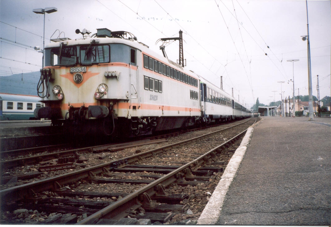 Comboio Corail procedente de Paris- Austerlitz com destino a Toulouse, a sair da estaçao de Lourdes, tracionado pela locomotiva nº 88534. Corail train from Paris-Austerlitz to Toulouse, departing Lourdes Station, pulled by loco nº 88534. Fotografia por/Photo by: Pedro Costa (09/08/2004) Pedroleonel@netvisao.pt |