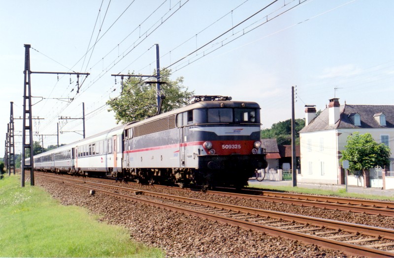 La BB 509325 en tête d'un "Corail Intercité" Bayonne-Toulouse assuré avec des voitures TER Midi-Pyrénées à Bordes (65) (25/08/2006)