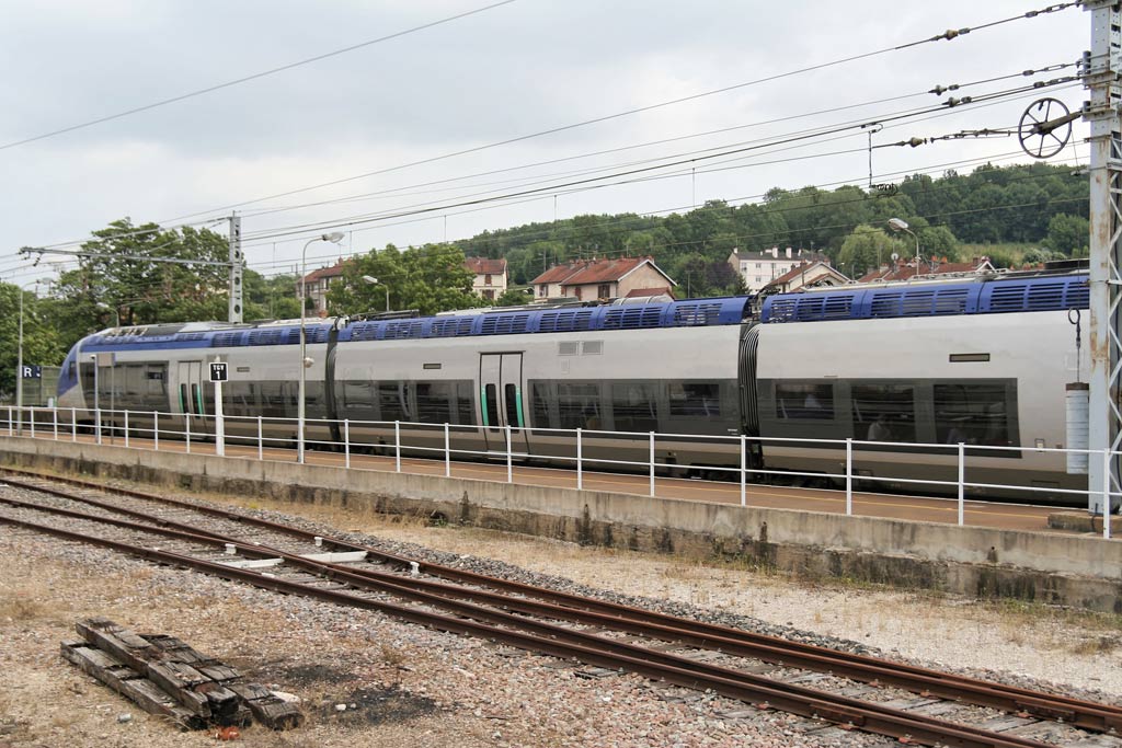 France - Gare SNCF de Montbard (Cte dĠOr) LĠAutorail Grande Capacit (AGC) srie B81500 bi-mode lectrique et diesel vient de dmarrer en direction de Dijon. Bien que sous catnaire 1500 V, il utilise son moteur diesel ! Train TER Bourgogne Auxerre-Dijon numro 91334/91335, dpart 17h15, arrive Dijon 17h56. 18/07/2005 Photo : Jacques Caillot #jcaillot@free.fr |