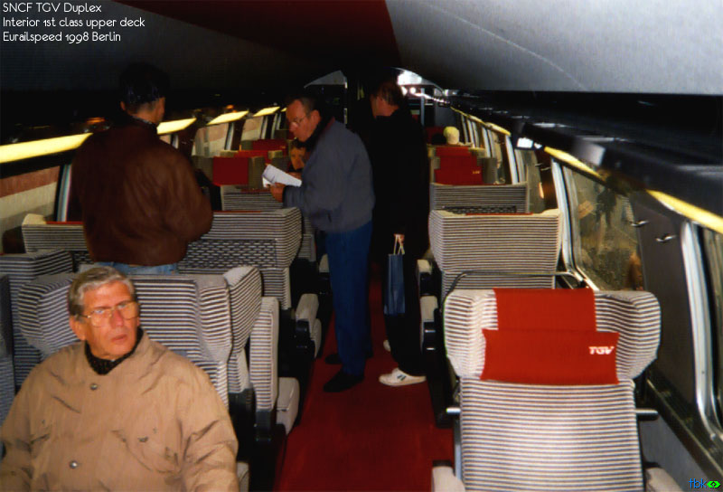 (SNCF) TGV-Duplex (Train Grande Vitesse - Duplex) Current system: 25kV 50Hz AC, 1.5kV DC Trainset 205 first class interiors - upstairs. Paris Gare de Lyon. March, 1997