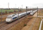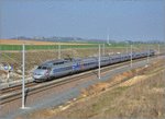 | SNCF TGV RESEAU Exceptional scene in the countryside of Beauce (60 km SW of Paris), by a cold win and rain. Service siding of Auneau St Léger. On the right are sided two double units of TGV Atlantique. Each one is about 400 m long. The nearest double unit is sided because of a breakdown. It was operating Tgv 8083/8715 bound for St Malo and Quimper. Another has entered the siding behind it, so as to allow passengers of the first one, to change train and climb on board. In the same time, a TGV RESEAU trainset is operating train 5470, bound from Strasburg for Rennes. It is passing over on the main line. November 23rd, 2008 PhotoPatrick Meunier, Website: PixyRail-Trains de Poissy |
