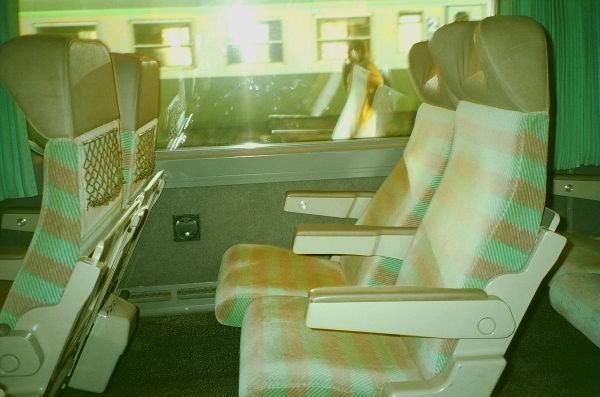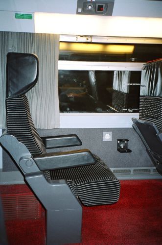 One can notice the individual power point, down the window, along with the folding cupholder. Lyon-Part Dieu. 20th April 2004.