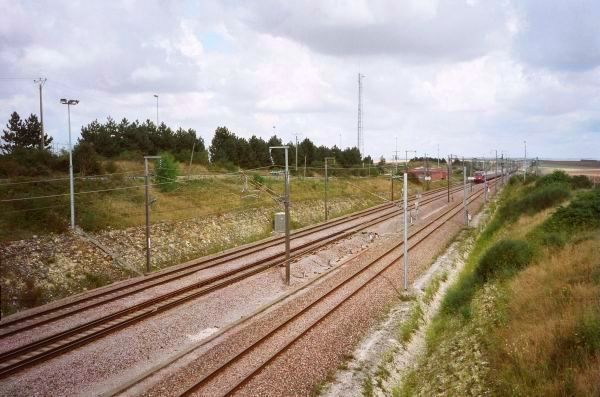 At this stage, TGV/Lyria traffic to Burgundy, Franche-Comté and Switzerland (via Vallorbe or Les Verrières) diverges towards the PLM conventional line, using the "Down" track further right. Pasilly Jct. 20th August 2005.