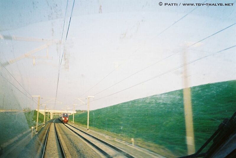 View out of a PBKA cab accelerating to 300 km/h (photo: 240km/h) onto another TGV-PBKA trainset running at full speed,