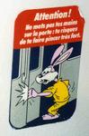 | Don't put your hands in the doorjambs! This is a warning from the Paris RATP and RER, to remind passengers not to put their fingers in the doorjambs. This is because the doors can open quickly and an injury may occur to passengers who place their fingers in the doorjambs, as the cartoon rabbit demonstrates. This warning may have been made in the late 1980s or early to mid 1990s. The same warning is used in the M14 in a different layout to be flush with the warning not to use the fold-down seats in crowded conditions. There is another similar warning on RER line C, with a bear- or cat-like animal instead of a rabbit. There is also an older picture of a rabbit sticking his fingers in the doorjambs, but in overalls, supposedly from the 1970's. Taken May 1997. (C) 1997, 2005 Josh Hanz (josh_hanz@hotmail.com) |