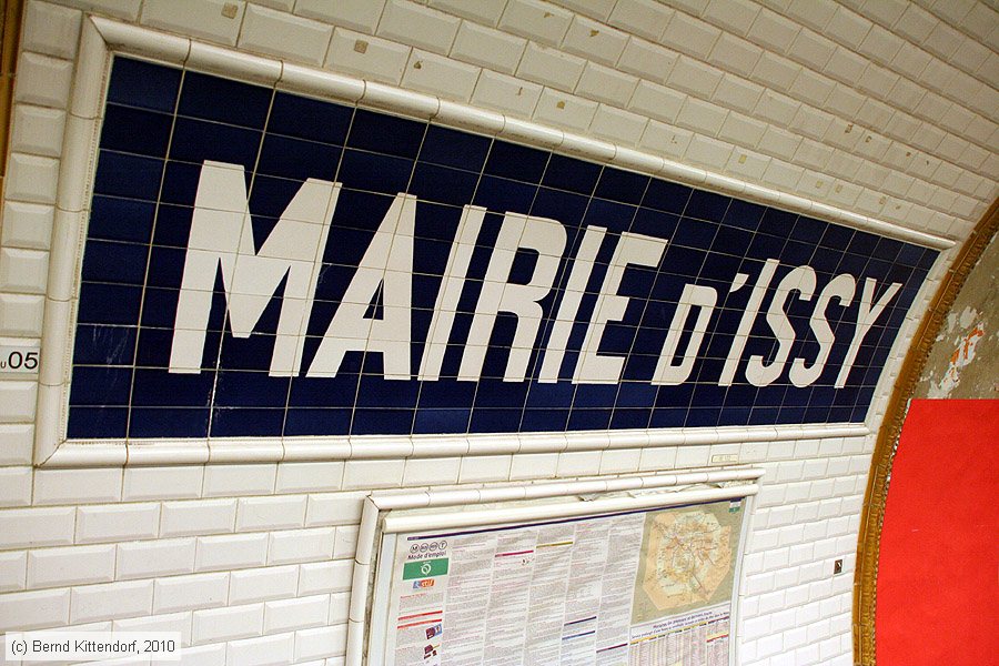 Metro Paris - Anlagen Name der Station Mairie d'Issy der Linie M 12 als Wandfliesen, aufgenommen am 20. Januar 2010. Diese Station wurde 1934 eröffnet.