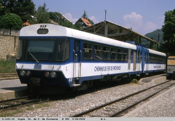 F. Narrow gauge 1m. Chemins de fer de Provence. Autorail X 351 en gare de Digne. 3-06-2000.