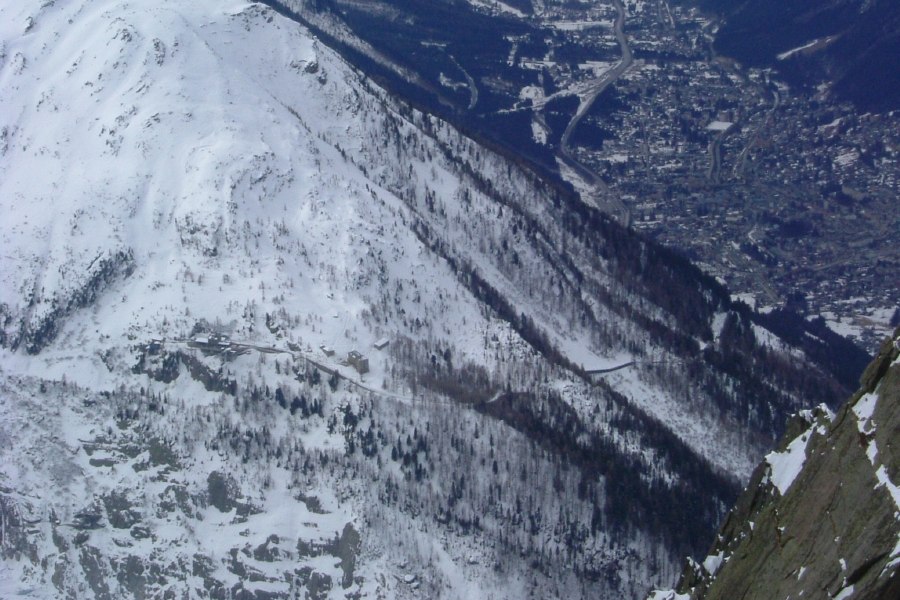 4 March 2004, Bochard above Argentièe, France Upper station of the Montenvers cog railway with Chamonix visible in the background.