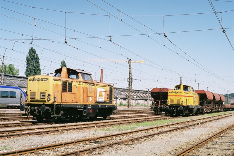 Colas-Rail F 60000-20 "Elisabeth" (UIC 99 87 9182 547-9, ex AT3 ATA 0676, origin DB 211-137-5, Deutz n° 57374/1962) and Meccoli 212-380-0 "Vincent" (UIC 99 87 9182 591-7). Pau (64), 22/07/2008. Photo Jean-Pierre Vergez-Larrouy (jean-pierre.vergez@tele2.fr) |