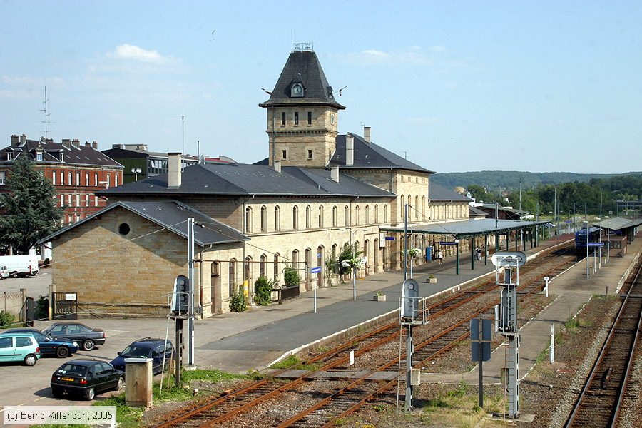 Gares SNCF - Sarreguemines Bahnhofsgebäude, Bahnsteige und Gleisanlagen in Sarreguemines, aufgenommen am 13. Juli 2005. Nur das Gleis ganz links hat Oberleitung für die Stadtbahn nach Saarbrücken.