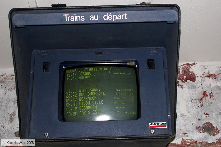 Gares SNCF - Belfort Abfahrt-Anzeige noch mit Röhren-Gerät in der Unterführung im Bahnhof Belfort am 29. März 2008.