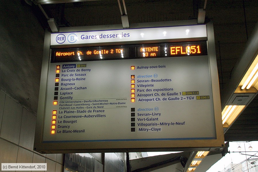 Paris RER B - Anlagen Fahrgastinformation auf der Linie RER B, aufgenommen in der Station Antony am 20. Januar 2010. Man kann bequem ablesen, wo der Zug halten wird.