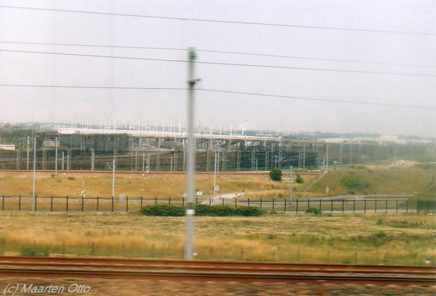 The french Eurotunnel terminal in Coquelles near Calais. Seen through a Eurostar window, summer 2003.