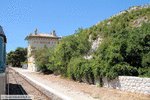Gares SNCF - Niolon Bahnsteig und nicht mehr besetztes Bahnhofsgebäude des Bahnhofs Niolon, aufgenommen am 08. August 2012. Diese Station befindet sich 55 km von Miramas an der Strecke Ligne de la Côte Bleue (Miramas über Martigues nach L'Estaque und weiter Richtung Marseille).