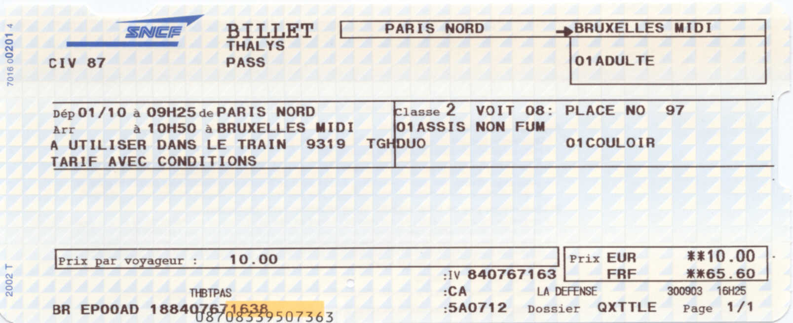 SNCF Billet Reservierung zu einer Fahrt mit einem INTERRAIL-Ticket 1.10.2003 Paris Nord - Bruxelles Midi Scan: M. Freitag (androstan@web.de) |