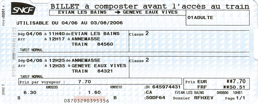 SNCF ticket Evian-les-Bains - Geneve Eaux-Vives 4.6.2006 Martin P. |