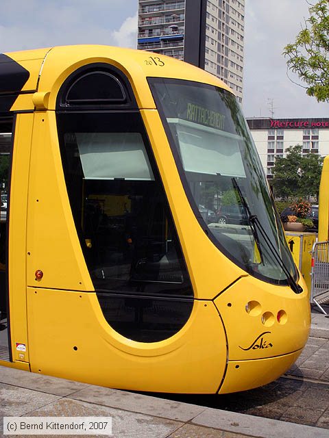 Tram Mulhouse - 2013 Triebwagen 2013 auf Linie 1 an der Haltestelle Porte Jeune am 09. Juni 2007.