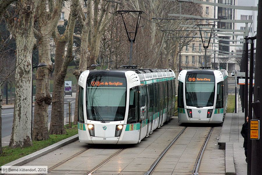 Straßenbahn Paris - 302 Triebwagen 302 (links im Bild) und 303 auf Linie T3 bei der Haltestelle Poterne des Peupliers am 19. Januar 2010.