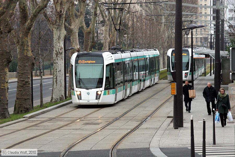 Straßenbahn Paris - 302 Triebwagen 302 auf Linie T3 an der Haltestelle Poterne des Peupliers am 19. Januar 2010.