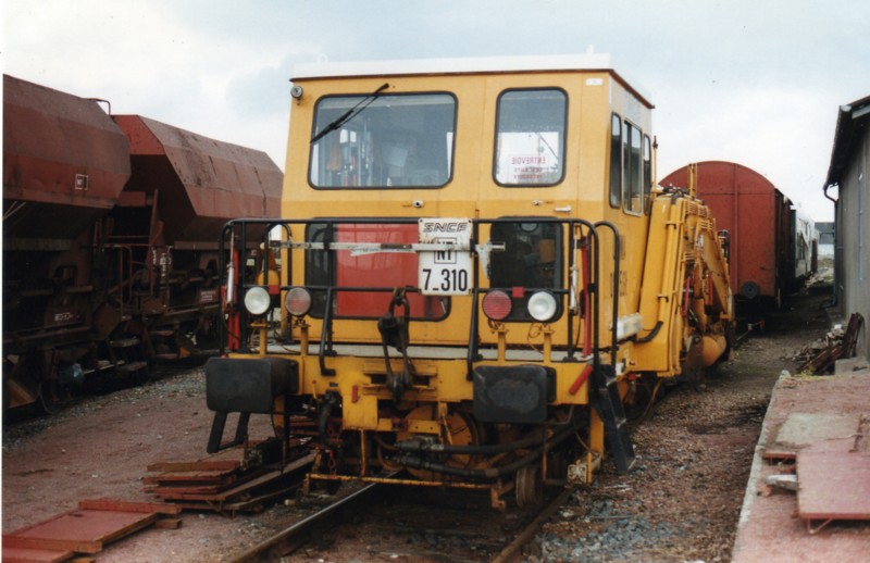 SNCF ballast tamping machine n° NT 7.310 (Framafer type 08.75 GV n° 117/1985). Thouars (79), 4/04/2000. Photo Jean-Pierre Vergez-Larrouy (jean-pierre.vergez@tele2.fr) |