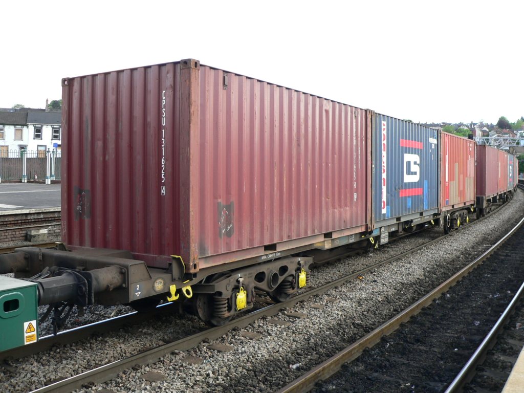 Container wagons on an eastbound freight service through Newport station in South Wales.