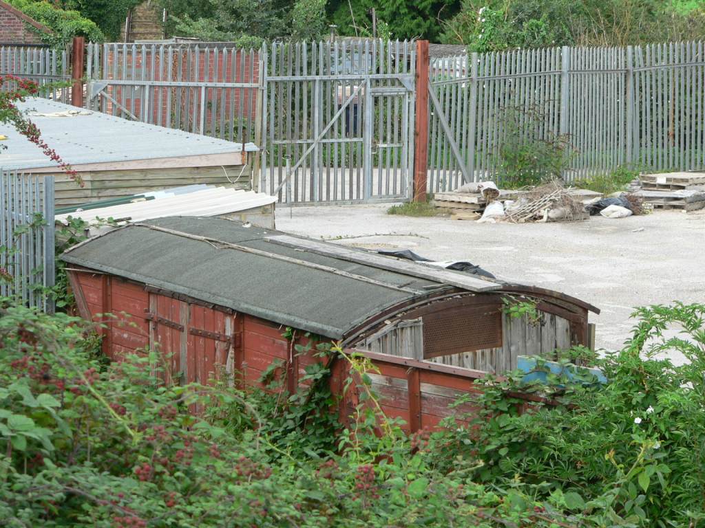 The remains of three old railway goods vans, constructed of corrugated iron and wood, that are being used for storage in the yard of a stone merchants, adjacent to Castle Cary railway station in Somerset. This photograph of a surviving identifier was taken from the lane between the station and yard; it appears to read VAN / 12t / tare / ??6494?.