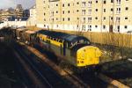 EWS CLASS 37/3. 37351 which is seen carrying the civil engineers (Dutch) livery with TransRail markings, is seen passing the site of the old Morningside station on the Edinburgh sub line while working an unidentified eastbound engineers train (possibly a Carstairs CE - Millerhill) on Fri 13-Feb-98 at 10:16.