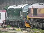 EWS Class 37 diesel locomotive 37411 Caerphilly Castle/Castell Caerffili, repainted into its orginal BR Green livery and carrying its pre-TOPS number D6990, stabled behind EWS Class 66 66187 at Godfrey Road Stabling Point adjacent to Newport station in South Wales.