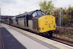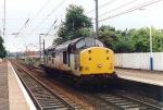 Class 37. 37796 is seen passing through Slateford station, Edinburgh with an unidentified westbound engineers train sometime during June-97.