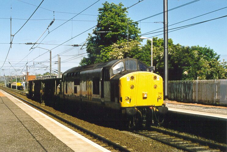 Class 37. 37796 is seen passing through Slateford station, Edinburgh with an unidentified westbound engineers train sometime during June-97.