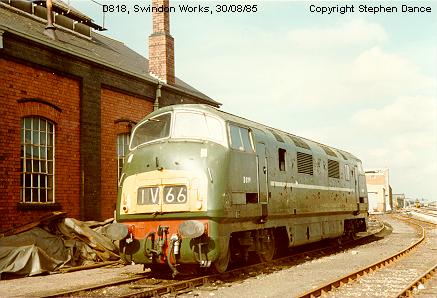 Class 42 'Warship', D818, named Glory, lies derelict at Swindon Works, 30/08/85. This locomotive was withdrawn in December 1972 after a service life of approximately 12 years. It languished in Swindon Works for the remaining 13 years of its existance, being occasionally used for apprentice painting practise. Despite being listed as preserved by a number of publications, D818 was cut up for scrap in October 1985 as part of the rundown and eventual closure of Swindon Works.