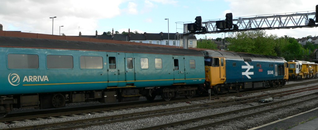 Bringing up the rear of an Arriva Trains Wales shuttle service of four Arriva-livieried Mark 2 coaches between Cardiff Central and Newport stations is Class 50 diesel locomotive 50049. The other loco of the pair on this top-and-tailed service is Class 37 diesel locomotive 37425 Pride of the Valleys, which like the Class 50 is in BR Large Logo livery.